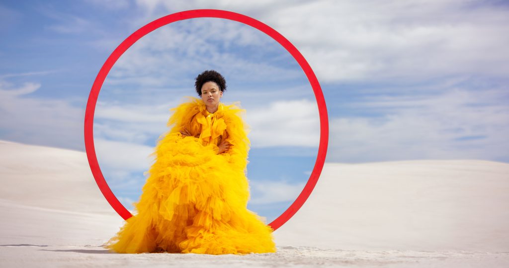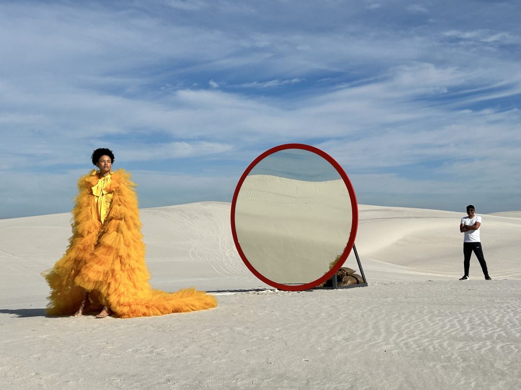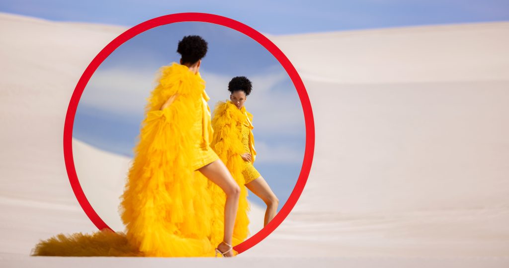 Our ideas soon lept from the sketchbook to reality as we designed and built an oversized circular mirror and erected it at dawn on the Atlantis Dunes, west of Cape Town. The unit had a perfectly colour-matched red frame (representing the red line that features on the professional lens range) and a rig that allowed its angle to be adjusted in order to provide an aesthetically pleasing reflection. Our model was prepared at our basecamp and carefully placed in position while we took great efforts to brush away any traces of footprints. Within an hour we had our shots, in-camera with no compositing or heavy retouching required.