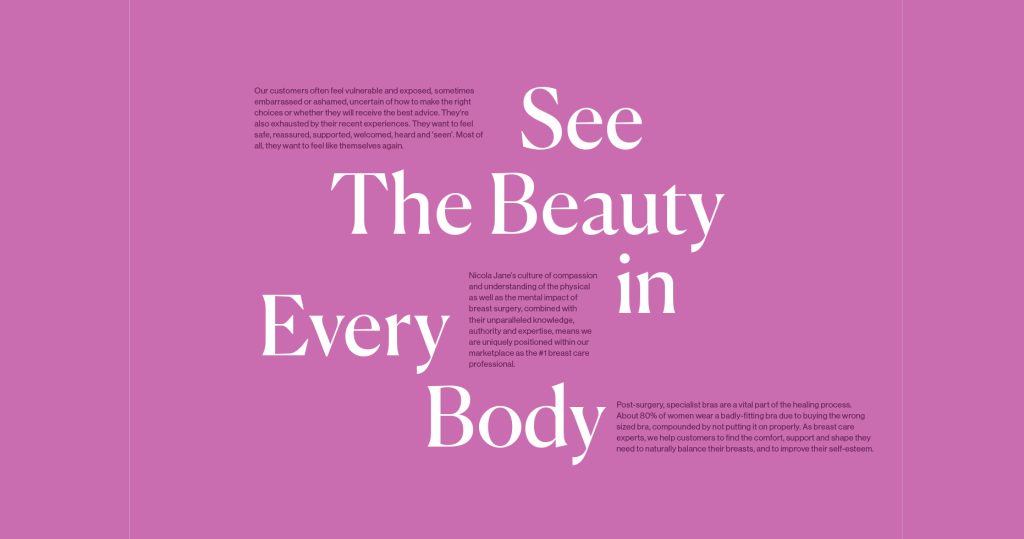 Following an intense period of discovery that included stakeholder interviews, desk research, report reviews, competitor analysis and customer segmentation, we outlined a strategic marketing plan and brand philosophy. Central to this was a Core Proposition “We See the Beauty in Every Body” and the strapline “Every Body Tells a Story”. We created a messaging matrix that employed a unique tone of voice to deliver marketing communications that each laddered up to that value proposition.